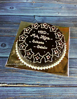 Kue kedua pesanan teman SMA saya, Ayu. Ia hanya meminta kuenya berbentuk bundar dan menyerahkan bentuk hiasannya kepada saya. Sayangnya saya tidak bisa menyelesaikan hiasannya dengan rapi. Tapi si Ayu tidak menanggapi SMS saya tentang itu, ia hanya bilang makasih. Duh, jangan-jangan si Ayu sungkan protes nih? Bikin penasaran saja.